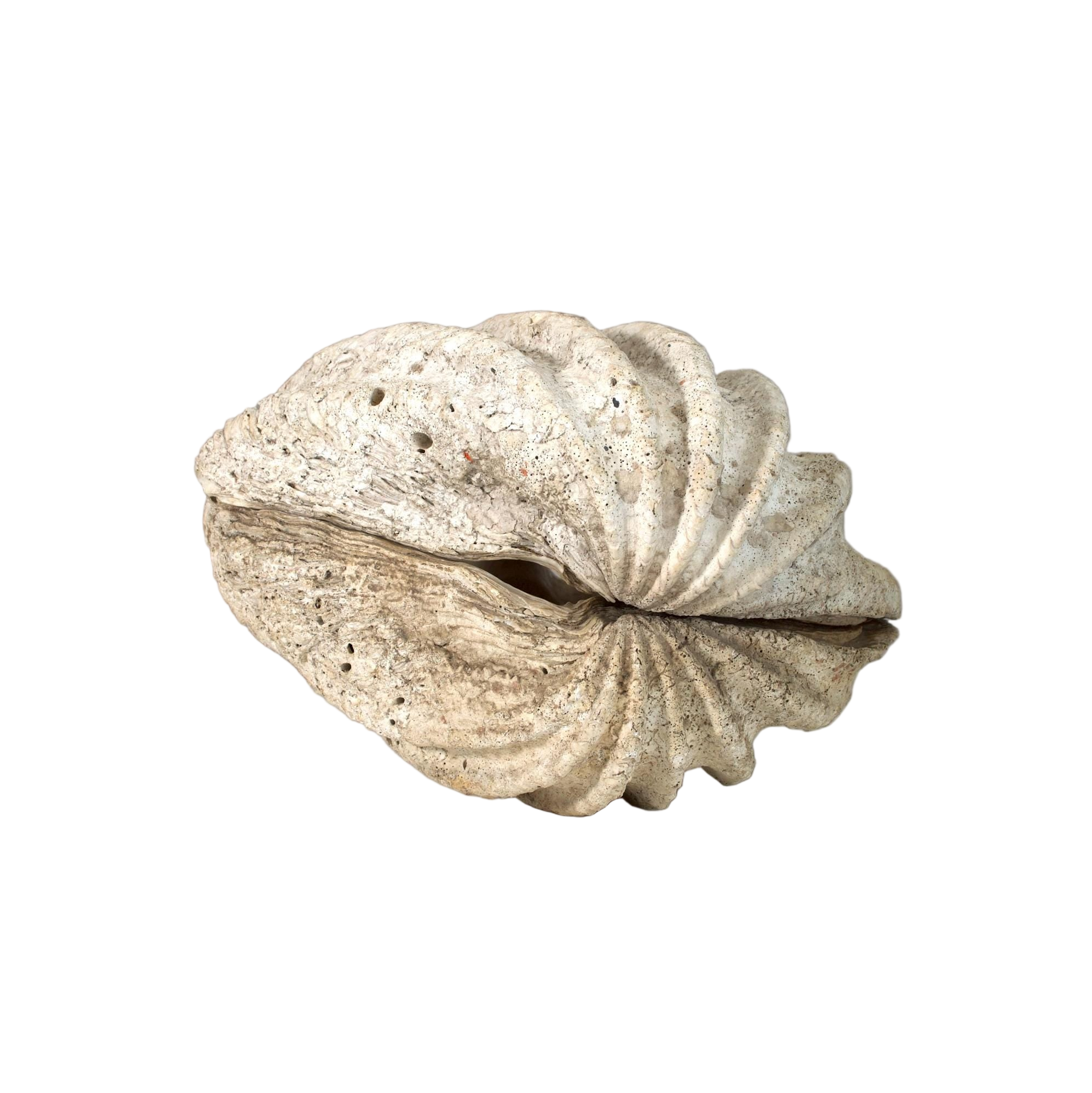 A remarkable decades-old ocean treasure, this weighty Tridacna shell showcases dramatic ridges, natural ivory tones, and sculptural form—an authentic coastal centerpiece unlike any other.