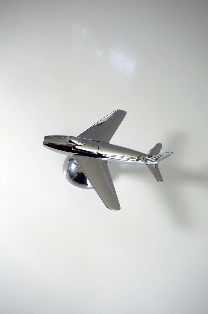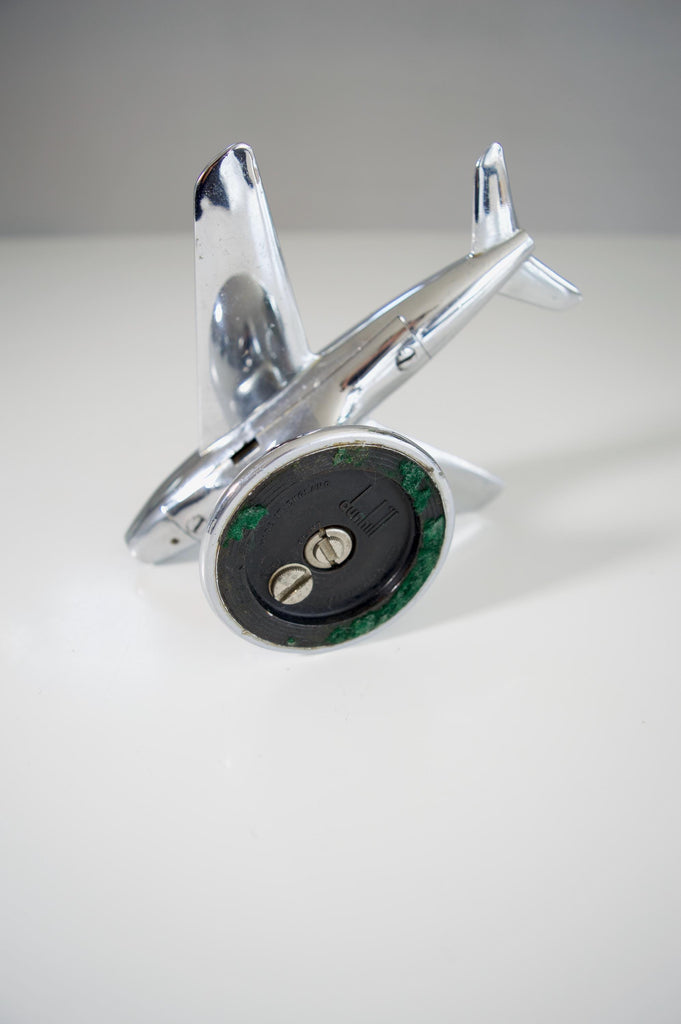 Superb mid-20th Century very rare chrome plated Dunhill lighter depicting the famous F-86 Sabre jet fighter aircraft, signed Dunhill on the base, made in England and the patent number. Push the nose of the plane to automatically lift the canopy and ignite the flame, a must have desk accessory for any aviation enthusiast.